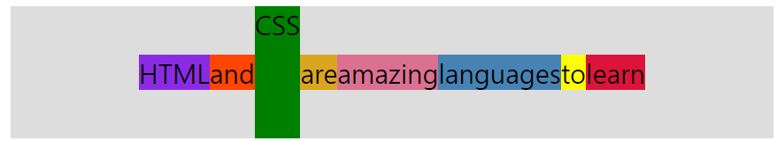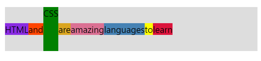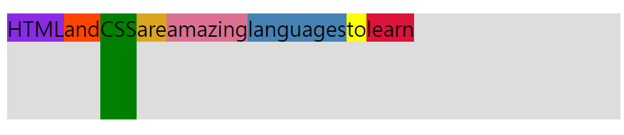 녹색은 세로로 정렬된다. flex container은 가장 높은 요소를 높이로 사용한다. 녹색을 제외한 너머지는 콘텐츠에 필요한 공간을 단순하게 차지하고 있다.