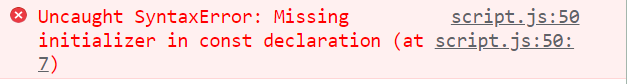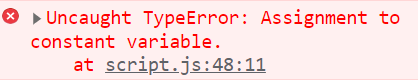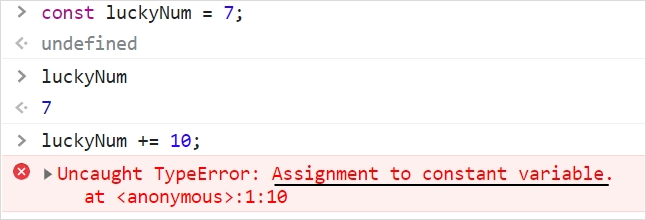 만일 let 대신 const를 사용하고 공백을 넣은 뒤 식별자를 아무거나 적고 =를 적고 값을 적으면 let과 동등하게 결과가 나올까? 아니다. 전혀 다르다.