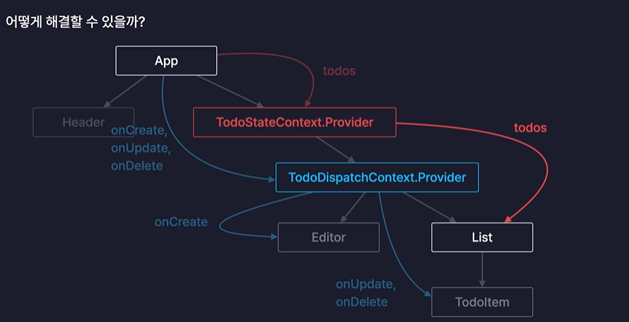 TodoContext 컴포넌트를 생성하고 해당 context의 Provider를 Editor 컴포넌트와 List 컴포넌의 부모 컴포넌트로서 설정해두면 된다. ValueProps로 App 컴포넌트 안에 있는 TodoState그리고 OnCreate, OnUpdata, OnDelete 함수를 객체로 묶어 전달했었다.