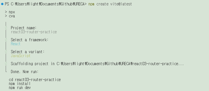 📁 새로운 리액트 파일을 만들기 위해서는 npm create vite@latest를 입력한다.
