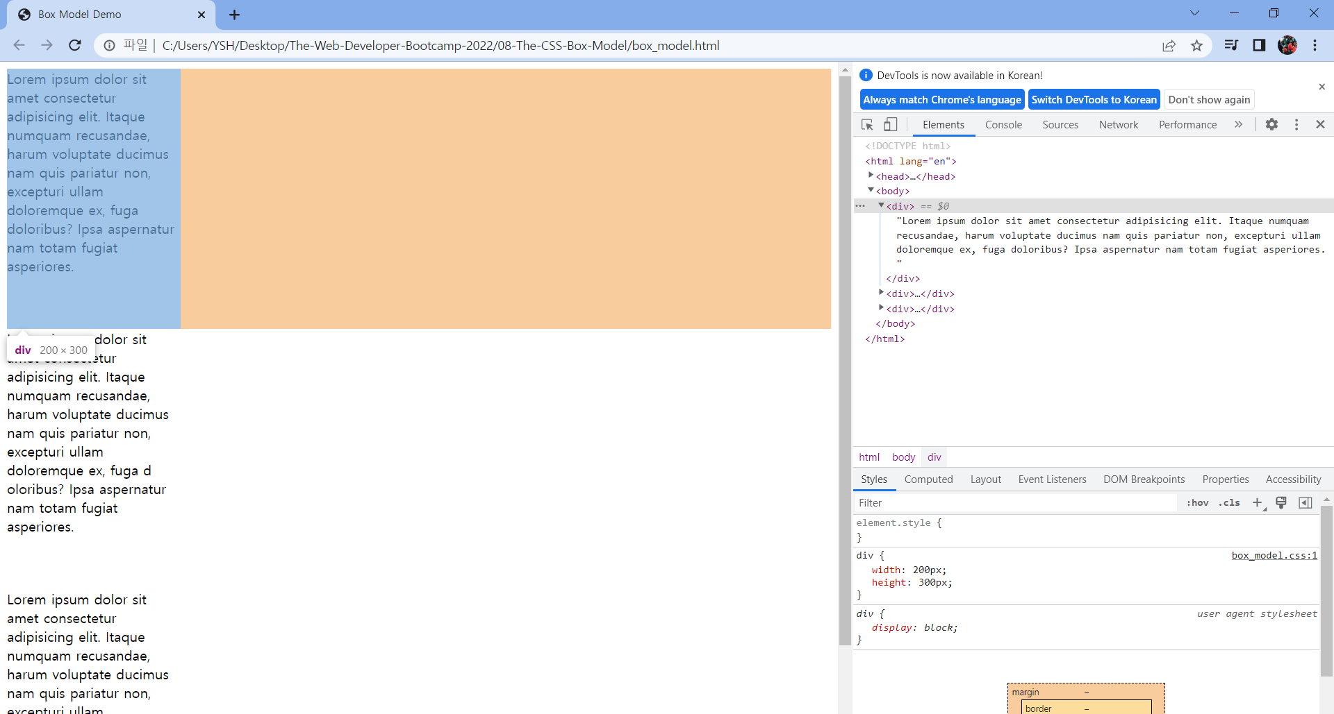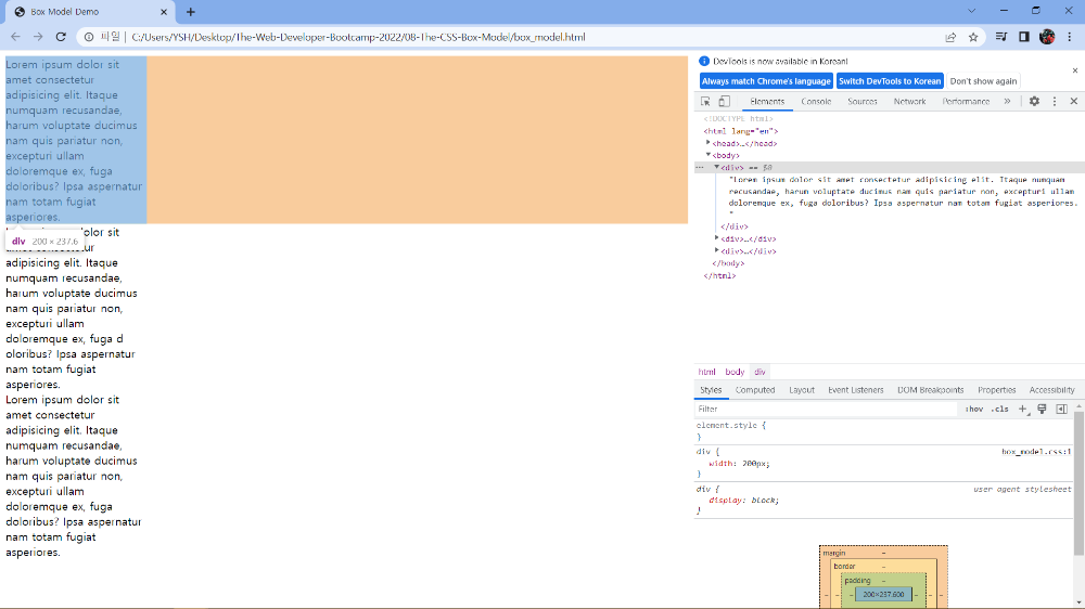 width값을 200px입력함으로 콘텐츠가 200px 만큼의 공간을 차지하게 되었다.
