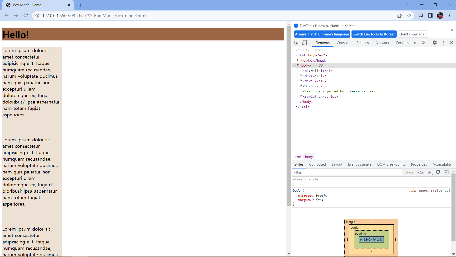 <h1> 태그에 Hello!를 입력해 색상을 추가했더니 가로 영역 전체가 갈색 컬러로 바뀌었다.