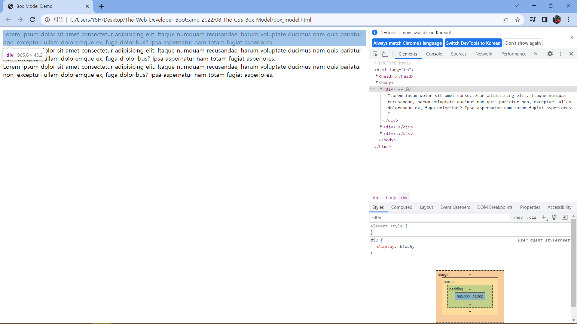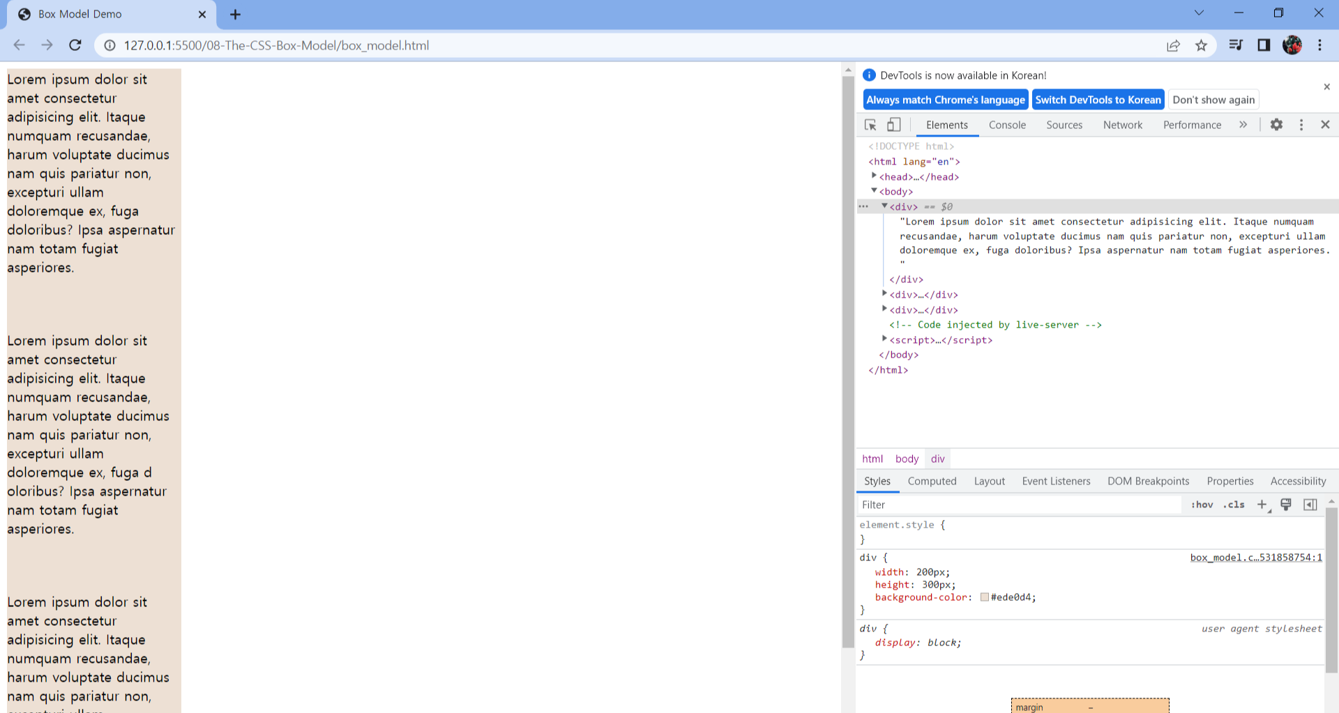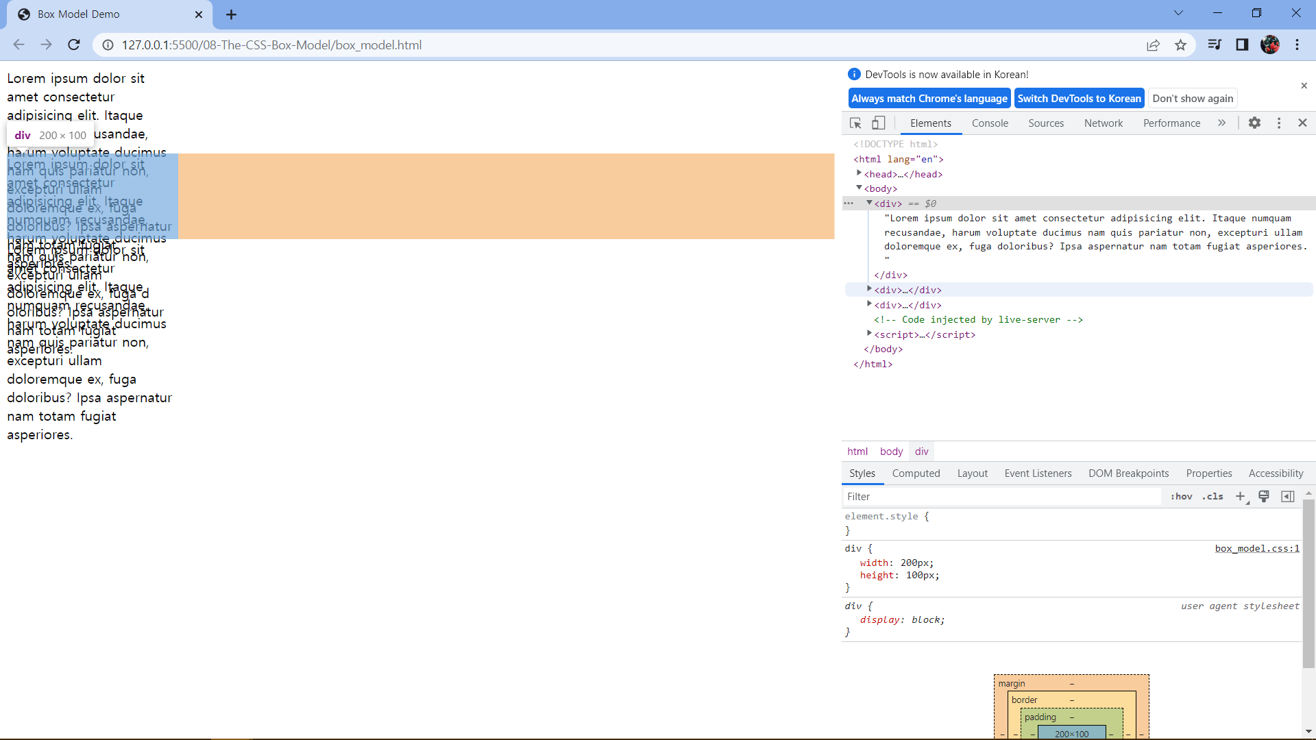 Box-sizing(박스 사이징)은 border-box로 설정된다. 그 설정은 테두리를 크기 기준으로 삼는다.)
